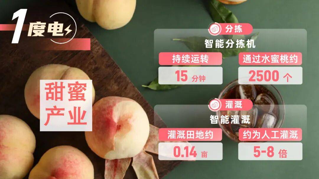 分拣,是水蜜桃产业链中至关重要的一环。以前,桃农手工分拣,损坏率大,现在通过智能分拣机,大小、色泽、糖度自动检测、分级,按成熟度分开存放。单台设备功率约5千瓦,分拣速度为每小时10800个,即1度电分拣2160个。效率提升20倍以上,成本降幅达81%。