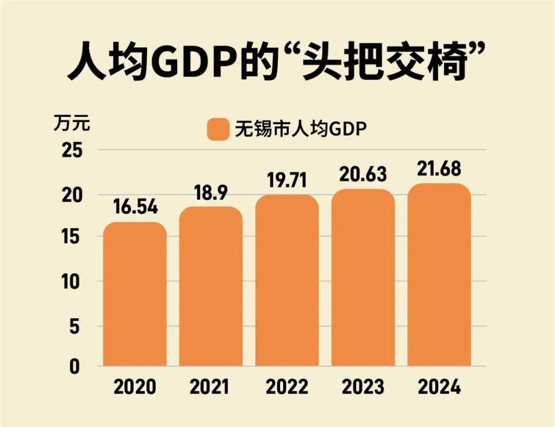 2024年,无锡人均GDP达21.68万元,是除鄂尔多斯等资源型城市外,国内人均GDP第一地级市。从5年前的16.54,到18.9、19.71、20.63,再到21.68,无锡始终遥遥领跑。
