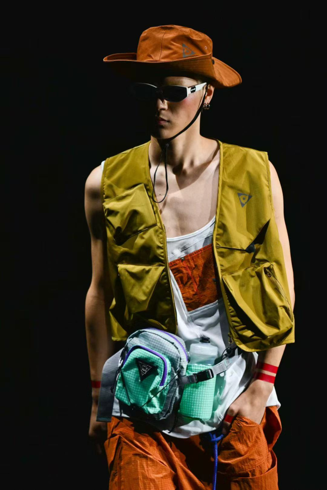 “文明胶囊” 系列以人类文明探索为灵感,衣身极光般的渐变效果与符号光影交织,暗含对“科技与文明关系” 的思考;“幻化异维” 系列则以可拆卸袖管外套、可收纳腰包马甲等可变形结构,与 NINETYGO 箱包形成场景联动,箱包承载生活,共同构建起年轻人 “全天候、全场景” 的出行美学体系。既延续实用主义核心,更传递“轻盈应对生活变化” 的态度。